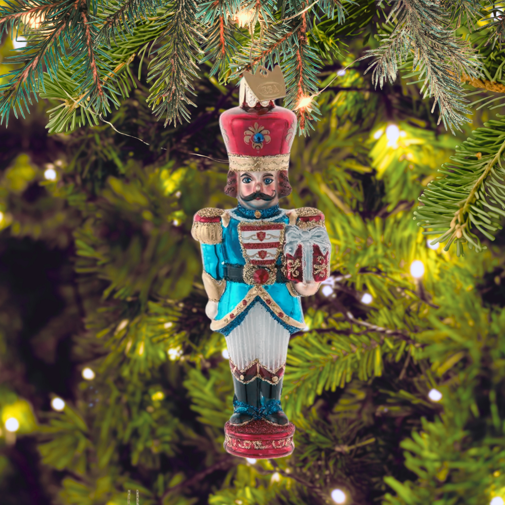 Add a touch of classic sophistication to your holiday décor with Kurt Adler's Noble Gems™ Glass Elegant Nutcracker Ornament. This beautifully crafted ornament features a stately nutcracker dressed in rich, vibrant colors with intricate details, from his ornate uniform to the shimmering gold accents. Made from high-quality glass, this nutcracker shines with a glossy finish and subtle touches of glitter that catch the light, making it a stunning addition to any Christmas tree.