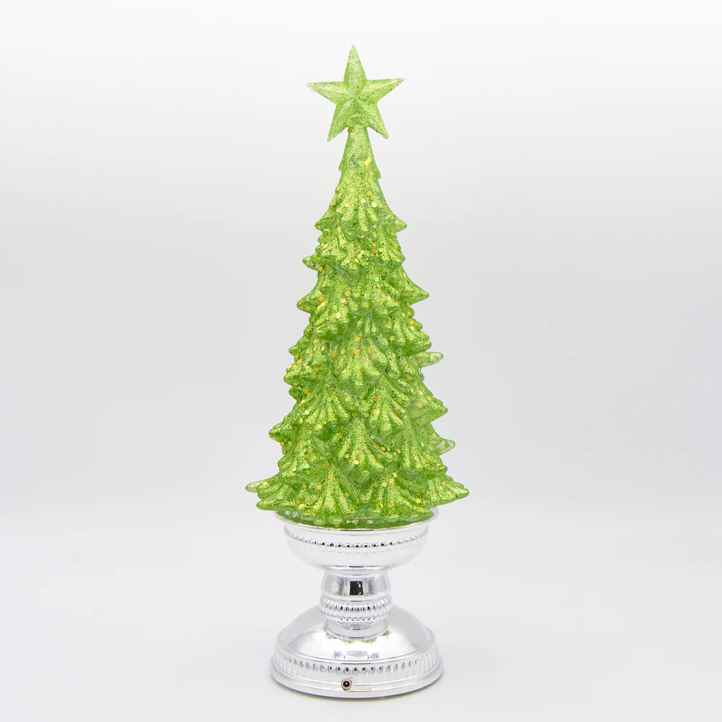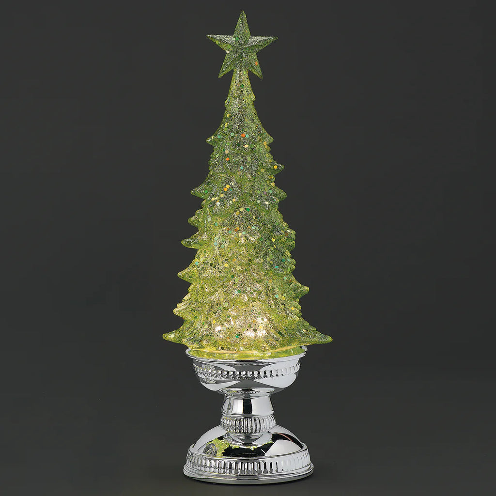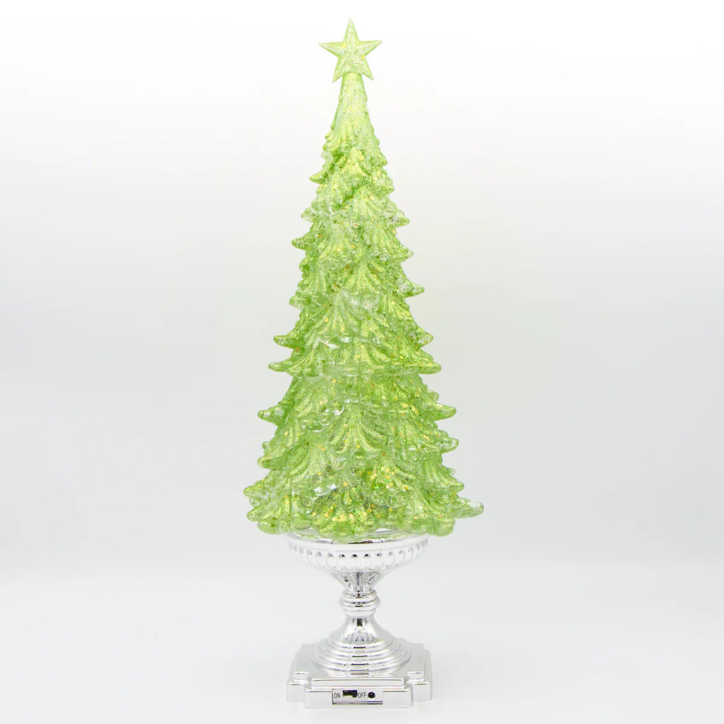Add a radiant glow to your holiday decor with this elegant green glitter tree, available in two sizes. Crafted from clear acrylic and filled with shimmering glitter, this festive tree sits atop a gleaming silver base and lights up from within to create a warm, magical ambiance. It's perfect for mantels, shelves, or entryways.